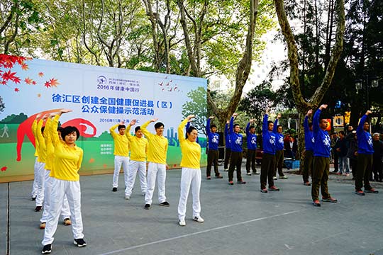 为进一步开展2016年健康中国行宣传,同时推进徐汇区全国健康促进县(区)创建工作,在上海市健康教育所指导下,徐汇区疾控中心结合健康教育与健康促进示范基地项目,2016年11月11日,在襄阳公园,举办了“2016年健康中国行:徐汇区创建全国健康促进县(区)公众保健操示范活动”。上海市健康教育所丁园所长、徐汇区疾控中心党总支王现书记以及上海市健康教育所控烟与行为干预部陈德部长出席了本次活动,并担任比赛评委。参加本次公健操展演的队伍为13家徐汇区健康促进示范基地成员单位,同时参与活动的还有各街镇社区卫生服务中心的健教干部以及湖南街道健康促进志愿者。